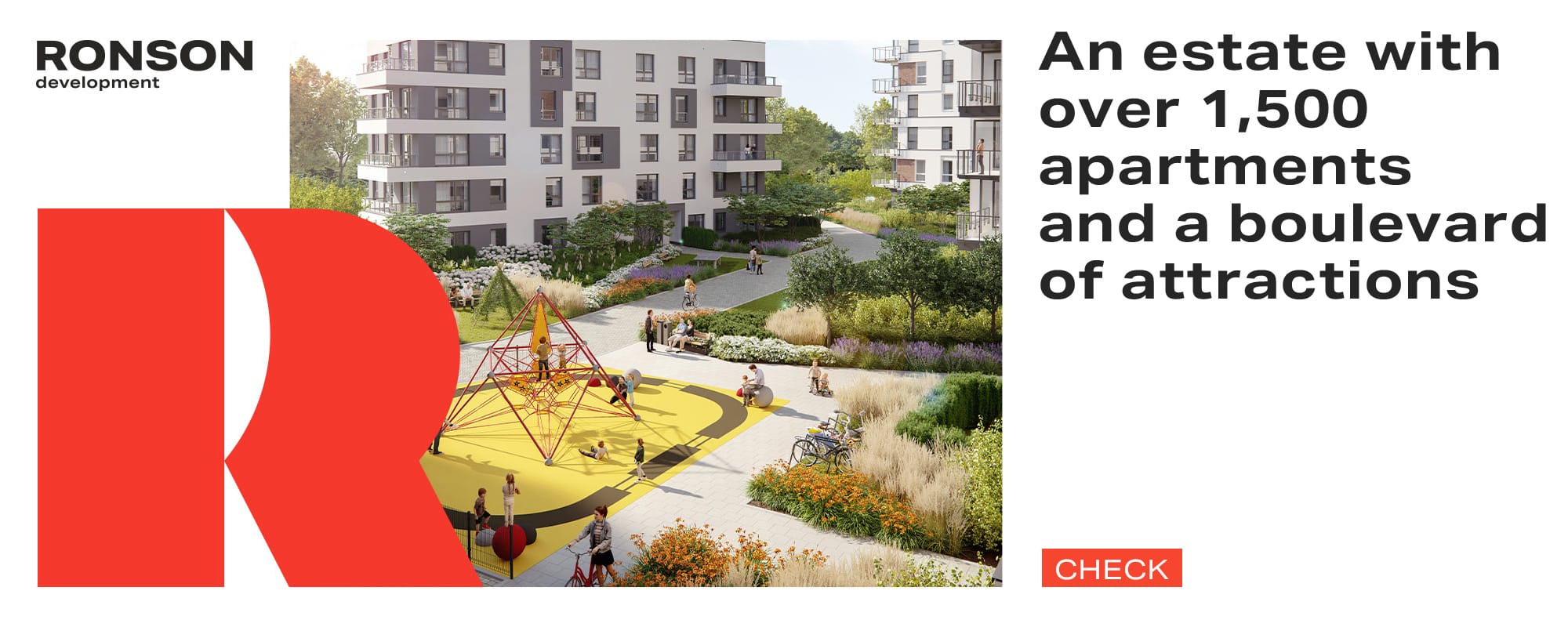 The central point of the estate is the Bulwar Atrakcji—a space where life focuses on relaxation, entertainment, and everyday services. Here, you will find numerous relaxation zones, fitness areas, playgrounds, and ponds, all surrounded by diverse greenery. Discover the biggest hit in RONSON Development's portfolio.