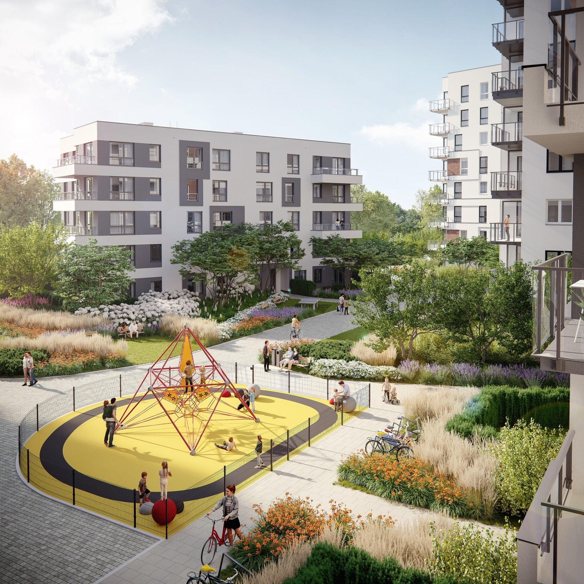 8 playgrounds, green spaces, educational paths, and table tennis tables are just some of the attractions we have prepared for the little ones. There will be space for many activities. The town square and the inner boulevard will be the perfect way to spend time with friends from school.