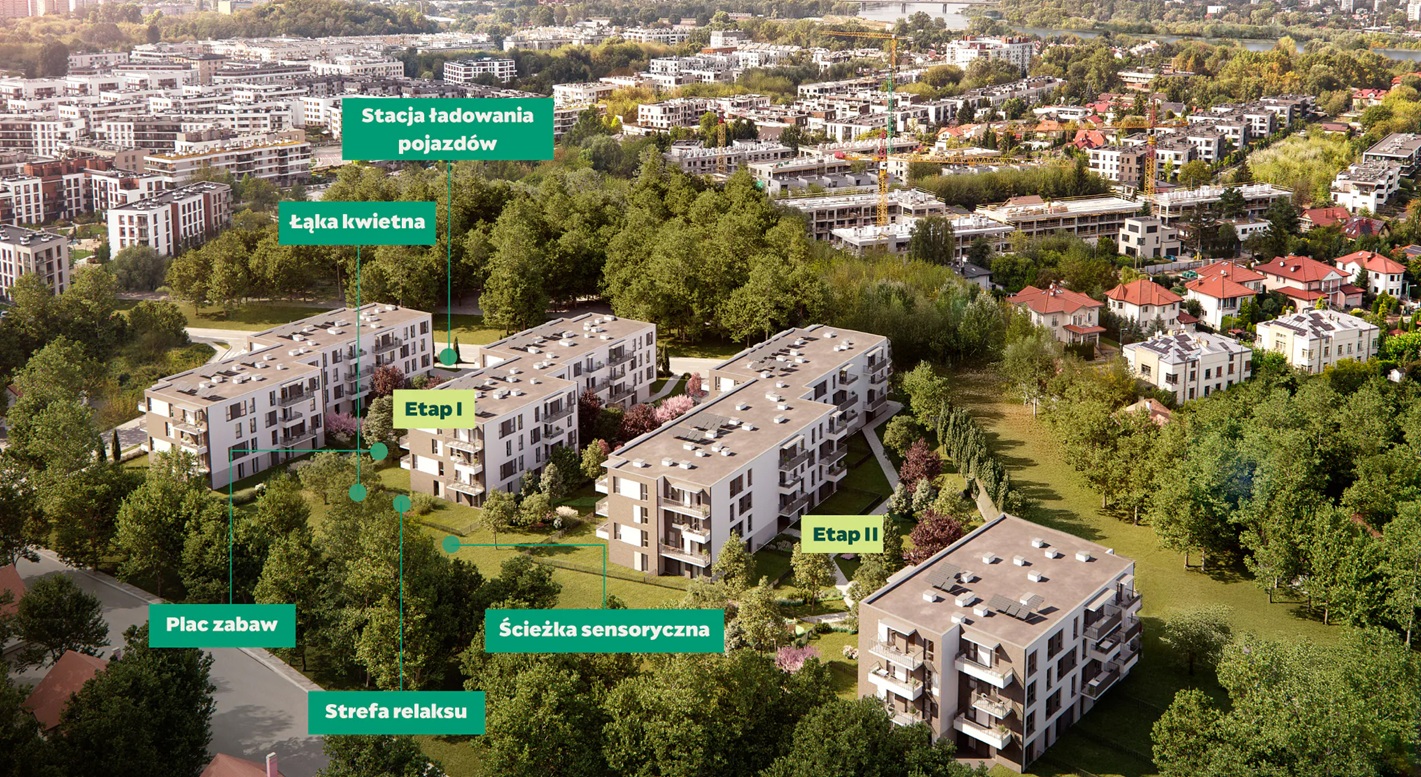 Jeśli marzy Ci się zamieszkanie w zielonej części Mokotowa, gdzie poczujesz nadwiślański klimat, to osiedle Zielono Mi będzie idealne dla Ciebie. To miejsce dla wymagających - postawiliśmy tutaj na bujną zieleń i wyjątkową estetykę wnętrz. Zyskujesz tu dostęp do szeregu ekologicznych i przyszłościowych rozwiązań, takich jak m.in. panele fotowoltaiczne oraz stacja ładowania pojazdów elektrycznych.
